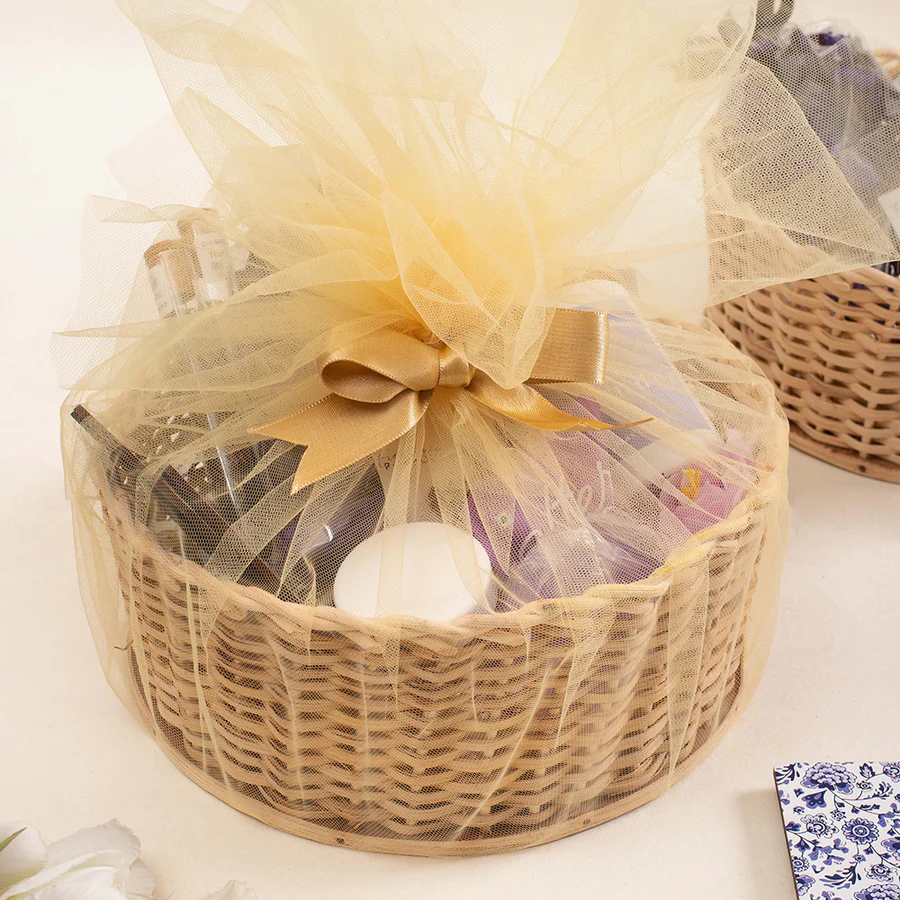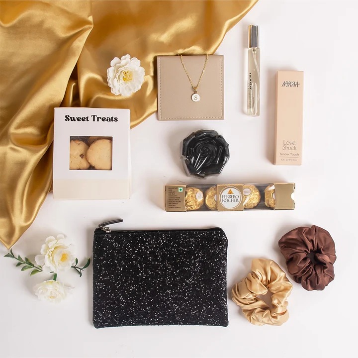 Glitter Pouch ( 6 x 2.5 x 4 inch )(Color as per the availability) Gold and Bronze Scrunchies (Set of 2) Ferrero Rocher Pack of 4 Personalized Initial Charm Necklace Nykaa Perfume 15 ml Handmade Nuts Cookies 6pcs in sweet treats box Rose Shape Charcoal Soap Reusable Cane Basket ( 25 x 20 x 10 cm)
